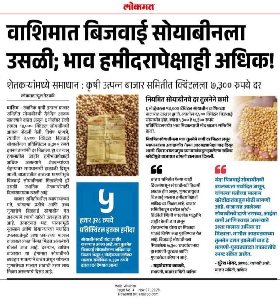 बिजवाई सोयाबीन ; वाशिम बाजार समितीत बिजवाई सोयाबीनला विक्रमी भाव